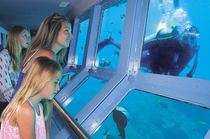 Explore the reef in a semi-submersible just one metre underwater with commentary (you can cruise as often as you like!) and be mesmerised from the underwater observatory as colourful fish dart and play in beautiful coral gardens. For exciting optional activities, first time divers can try an introductory dive and certified divers travelling with family or non-diving companions can experience up to two certified dives. There’s helmet diving, marine biologist snorkel tours and for a totally different perspective, scenic helicopter flights too.