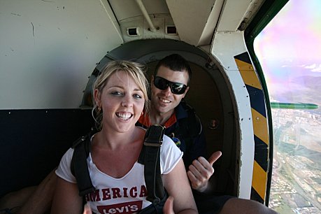 Standing on the precipice of choice, your knuckles are clenched tightly as you work up the courage to make the jump. With a little assistance from your tandem master, you take that giant leap forward - thereï's no turning back now! You try to scream, but the speed of the wind rushing past your face makes it difficult, so instead, you open your eyes wide and take in the experience, now realising that you feel safe, even though you are plummeting towards the earth at an unbelievably fast speed.
