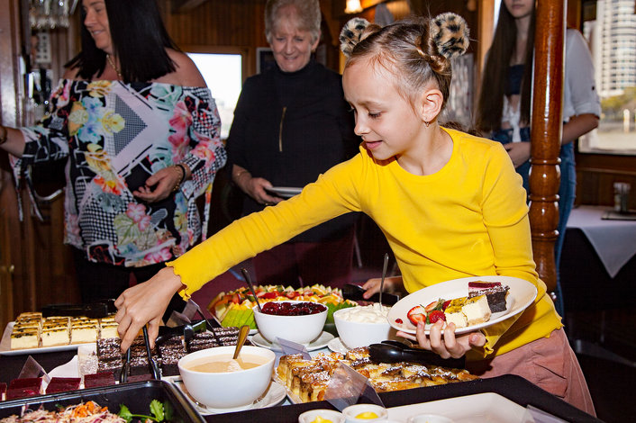 - Teens (13-17 years) include buffet meal (as above) + soft-drink & juice Child (4-12 years) includes 2-tier kids stand + soft-drink & juice Infants (3 years and under) free of charge (no meal provided). Must be included in booking. If you would like your infant to recieve a kids meal as outlined below, please book them as a child. Kids menu (4-12 years): Tier 1: Chicken slider, cheddar cheese (G) Pulled beef tartlet (G) Chicken nugget (G) Crispy fries with tomato sauce (G) Tier 2: Chocolate mousse (G) Watermelon (G) Chocolate fondant (G) Fresh Seasonal Fruit Sample menu only, subject to change Vegetarian & Vegan platters available. Must be pre-booked at time of reservation